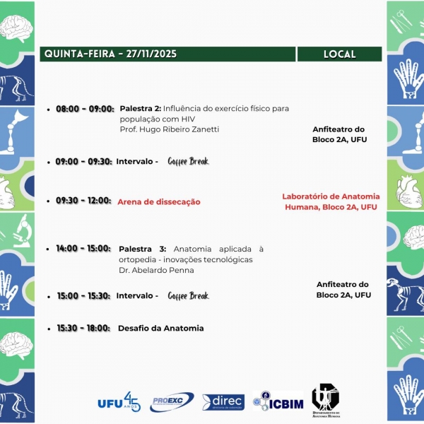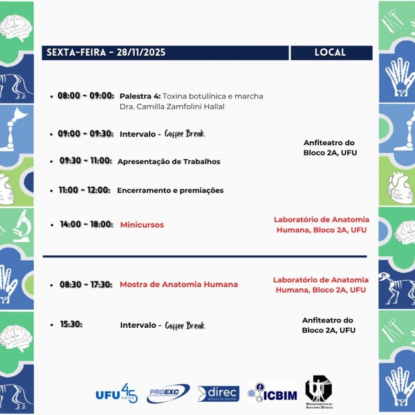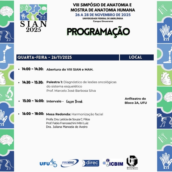 É com imensa felicidade e entusiasmo que o Departamento de Anatomia Humana do Instituto de Ciências Biomédicas-ICBIM/UFU está planejando o VIII Simpósio de Anatomia e a VIII Mostra de Anatomia Humana. Neste ano, temos a alegria de anunciar que o evento será realizado de forma presencial!