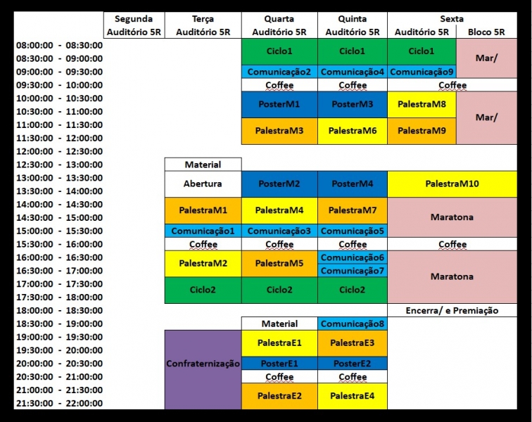 • Solenidade de abertura, confraternização e encerramento. Dentre as atividades programadas para esta atividade estão as entregas de premiações para os vencedores da maratona e melhores posteres, agradecimentos e atividades artísticas.