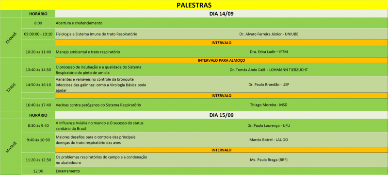 Durante 14 anos a Faculdade de Medicina Veterinária da Universidade Federal de Uberlândia já realizou nove encontros técnicos de ciência e tecnologia avícolas. Para este ano, em especial, estamos organizando o X ENCONTRO TÉCNICO CIÊNCIA E TECNOLOGIA AVÍCOLAS com o tema: “A saúde do sistema respiratório: biossegurança, prevenção e controle”. O programa abordará a importância da saúde do sistema respiratório em frangos, poedeiras comerciais, reprodutoras e perus. Assim, serão abordados desde aspectos do manejo ambiental, tratamento consciente, manejos preventivos e alternativa.