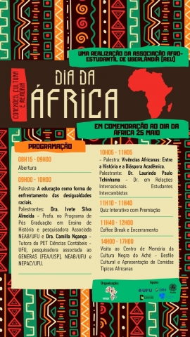 A Associação Afro-Estudantil de Uberlândia (AEU), em parceria com o Programa de Formação para a Internacionalização da Universidade Federal de Uberlândia (Proint/UFU), realiza o evento "Dia da África - Conexões, Cultura e Memória. Ele será realizado no proximo dia 13 de junho, sexta-feira, das 8h às 17h, no anfiteatro do Bloco 3Q do Campus Santa Mônica.