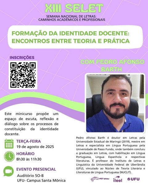 A XIII Semana Nacional de Letras (SELET) da Universidade Federal de Uberlândia (UFU) tem como propósito promover um espaço de diálogo, reflexão e intercâmbio entre estudantes, docentes, pesquisadores e profissionais da área de Letras, com foco nas múltiplas possibilidades de atuação acadêmica e profissional. A edição de 2025 busca ampliar os horizontes de quem transita pelo universo das Letras, explorando percursos possíveis nos campos da pesquisa, do ensino e do mercado de trabalho.