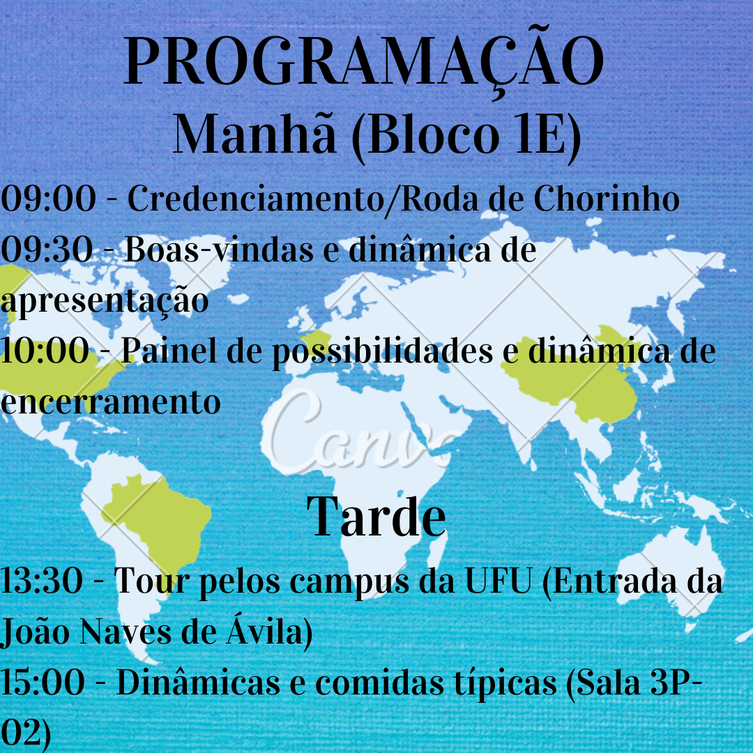 - Após o tour, acontecerão dinâmicas com comidas típicas do Brasil, por volta das 15h, na sala de reuniões da DRII, no Bloco 3P do Campus Santa Mônica.