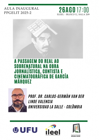 A aula inaugural do Programa de Pós-Graduação em Estudos Literários, (PPGELIT), do Instituto de Letras e Linguística da Universidade Federal de Uberlândia (Ileel/UFU), recebe professor Carlos-Germán Van Der Linde Valencia, da Universidad la Salle, na Colômbia. O tema do encontro será “A paisagem do real ao sobrenatural na obra e coluna jornalística, contista e cinematográfica de Garcia Marquez”.