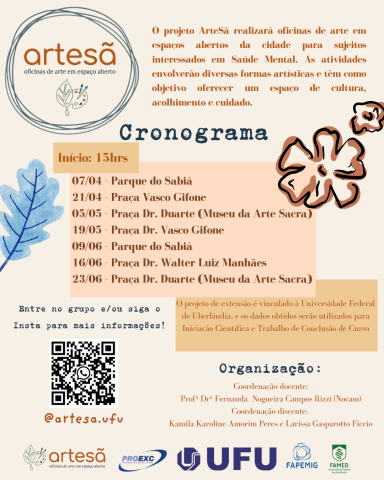O projeto de extensão “ArteSã: Oficinas de Arte em Espaço Aberto” oferece oficinas em diversas vertentes artísticas de forma gratuita para qualquer pessoa interessada. O intuito é fornecer um espaço de cuidado e acolhimento voltado à saúde mental. O projeto ocorre de 7 de abril a 23 de junho em diversos locais públicos da cidade, de forma itinerante. Os encontros serão realizados por artistas das áreas específicas, convidados pelos organizadores.