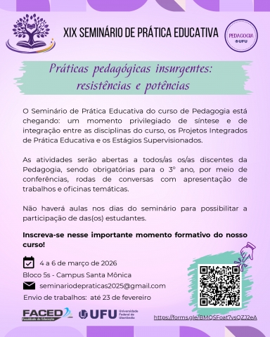 O XIX Seminário de Prática Educativa do curso de Pedagogia da Faculdade de Educação da Universidade Federal de Uberlândia (Faced/UFU) acontece nos dias 4 a 6 de março de 2026. O evento abrangerá palestras, vivências literárias, apresentação de trabalhos e oficinas temáticas, com atividades no período da manhã, da tarde e da noite.