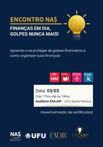 A educação financeira e a proteção contra a violência financeira cometida por terceiros — os "golpes" — são o foco central do "Encontro NAS - Finanças em dia, Golpes Nunca Mais!". A atividade tem como objetivo conscientizar e empoderar não apenas os assistidos pelo projeto, mas toda a comunidade acadêmica e externa.