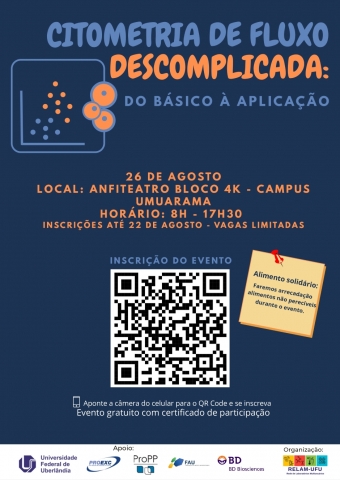 O evento “Citometria de Fluxo Descomplicada: do Básico à Aplicação” é organizado pela Rede de Laboratórios Multiusuários da Universidade Federal de Uberlândia (Relam/UFU). As palestras ocorrerão no anfiteatro do bloco 4K, do campus Umuarama, no dia 26 de agosto. O objetivo é atualizar o conhecimento e capacidade de aplicar a citometria de fluxo para membros da comunidade UFU e de fora dela.