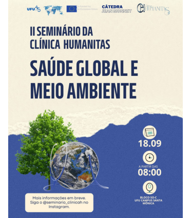 A Clínica Humanitas, vinculada ao curso de Direito da Universidade Federal de Uberlândia (UFU), tem a alegria de apresentar o seu II Seminário sobre Saúde Global e Meio Ambiente.