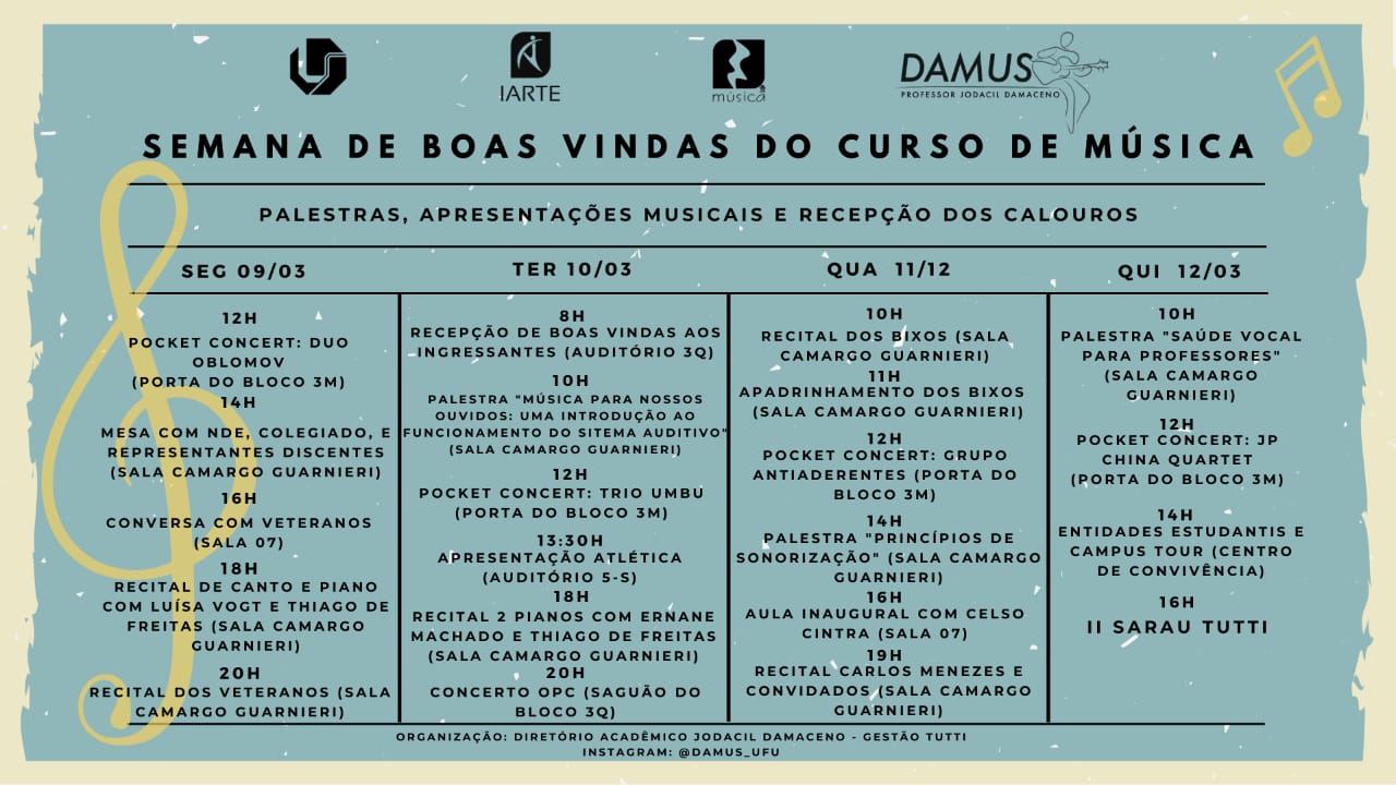 Os estudantes e a coordenação do curso de Música da Universidade Federal de Uberlândia convidam a todos para prestigiarem as atividades da semana de recepção aos novos alunos, entre os dias 9 e 12 março. Foram programados diversos recitais e palestras, todos com participação dos alunos, professores, técnicos e ex-alunos do curso.