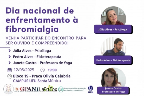 O "Dia Nacional de Conscientização e Enfrentamento à Fibromialgia" ocorrerá na próxima segunda-feira (12/5), em uma parceria entre o Programa de Pós-Graduação em Genética e Bioquímica da Universidade Federal de Uberlândia (PPGGB/UFU), o Grupo de Pesquisa em Analgesia e Inflamação (GPANI) e o Laboratório de Bioquímica e Toxinas Animais (LaBiTox).