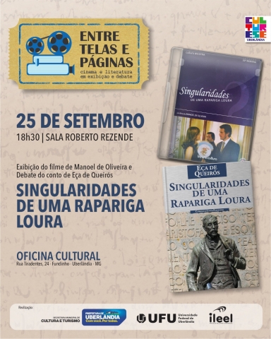 A iniciativa surgiu do Projeto Entre telas e páginas, do Instituto de Letras e Linguística da Universidade Federal de Uberlâdndia (Ileel/UFU), em parceria com a Secretaria Municipal de Cultura e Turismo de Uberlândia. O filme "Singularidades de uma rapariga loura" é uma adaptação do livro de mesmo nome escrito por Eça de Queirós. A obra traz a história amorosa de Macário que se encontrava numa estalagem na região do Minho com o narrador. A sessão acontece na Oficina Cultural de Uberlândia, às 18h30, na segunda-feira, 25/09.