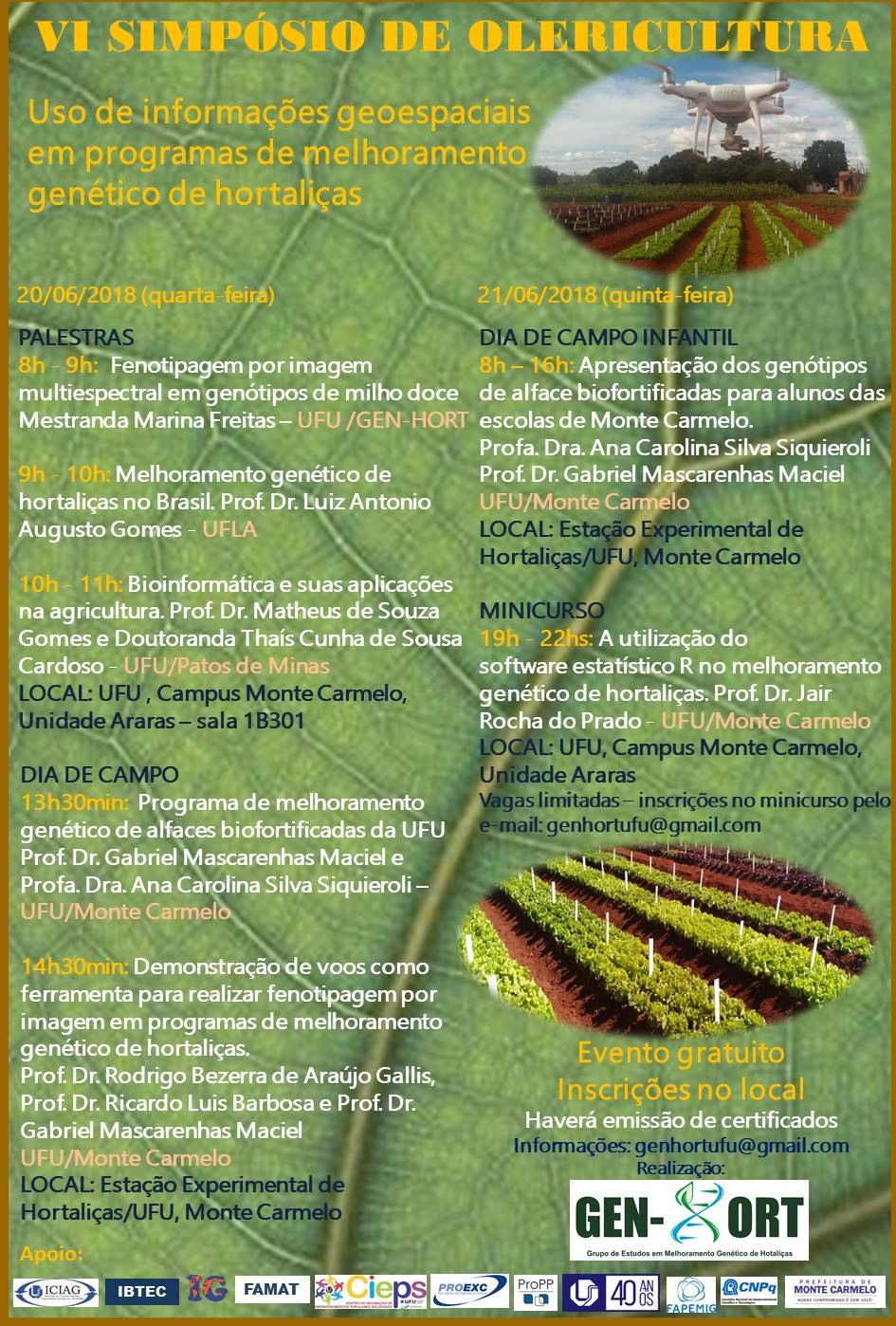 O Campus Monte Carmelo recebe, nos dias 20 e 21 de junho, o VI Simpósio de Olericultura, que irá discutir o uso de informações geoespaciais em programas de melhoramento genético de hortaliças. O evento contará com palestras e com o Dia de Campo, atividade que tem como objetivo divulgar para a região os resultados do Programa de Melhoramento Genético de Alface Biofortificada da UFU, além de seleção das futuras cultivares pela comunidade e por alunos das escolas do município para registro no RNC/MAPA.